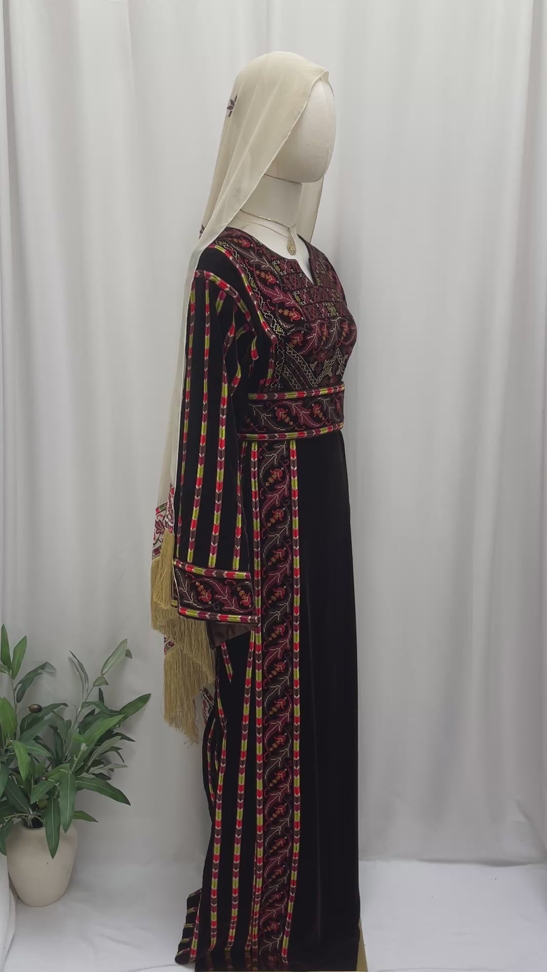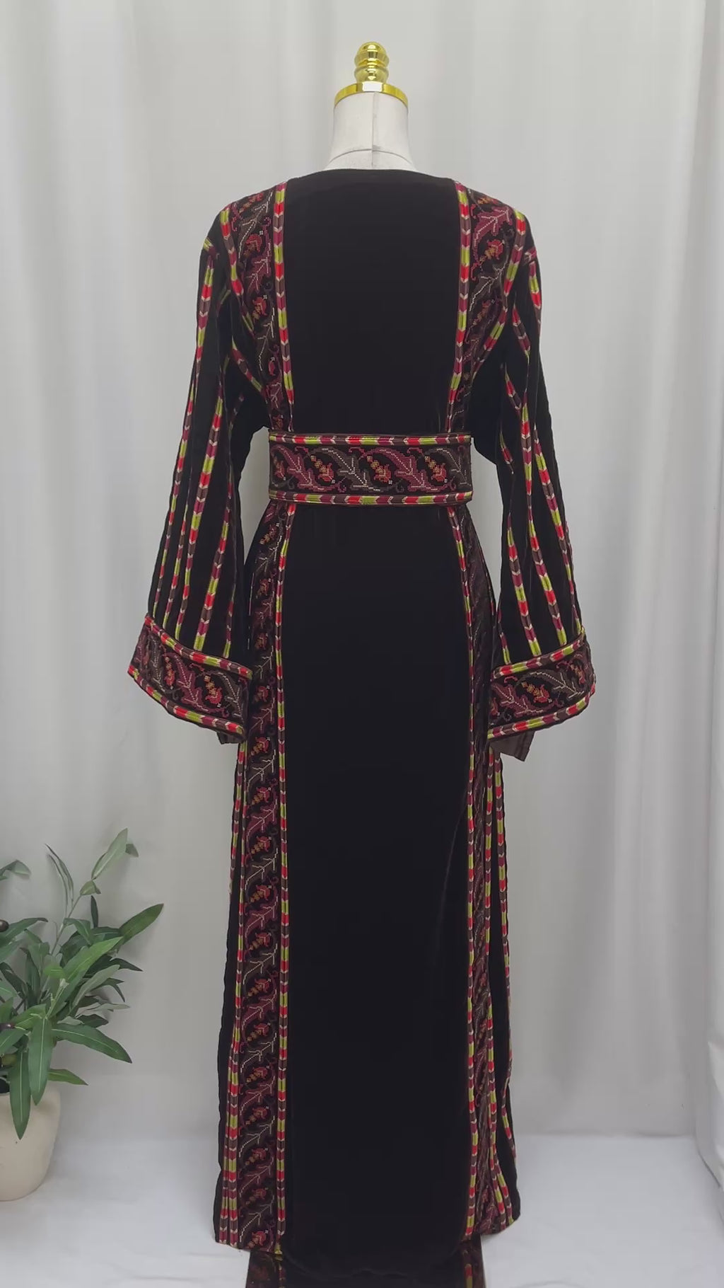 A luxurious deep-brown velvet Palestinian thobe, adorned with rich traditional embroidery across the bodice, sleeves, and side panels.