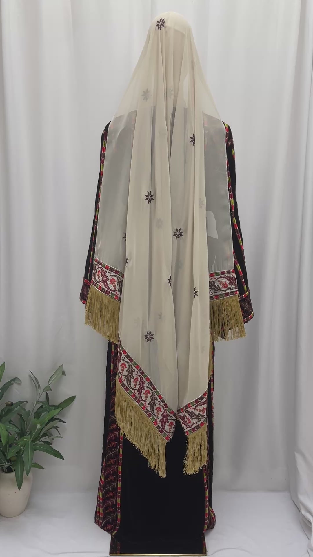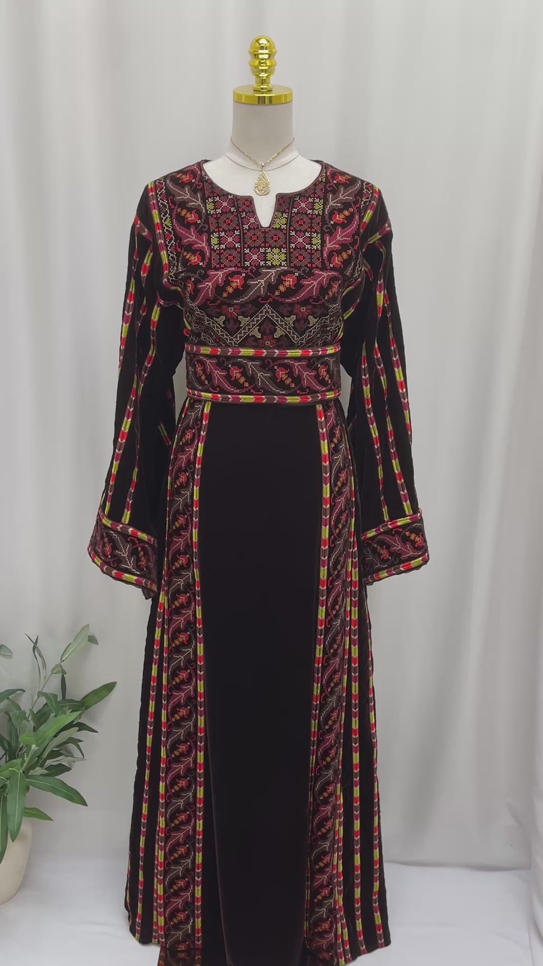 ثوب مخمل فاخر بدرجات البني العميق، مطرّز بتطريز فلسطيني تراثي غني بالتفاصيل على الصدر والأكمام والجوانب.