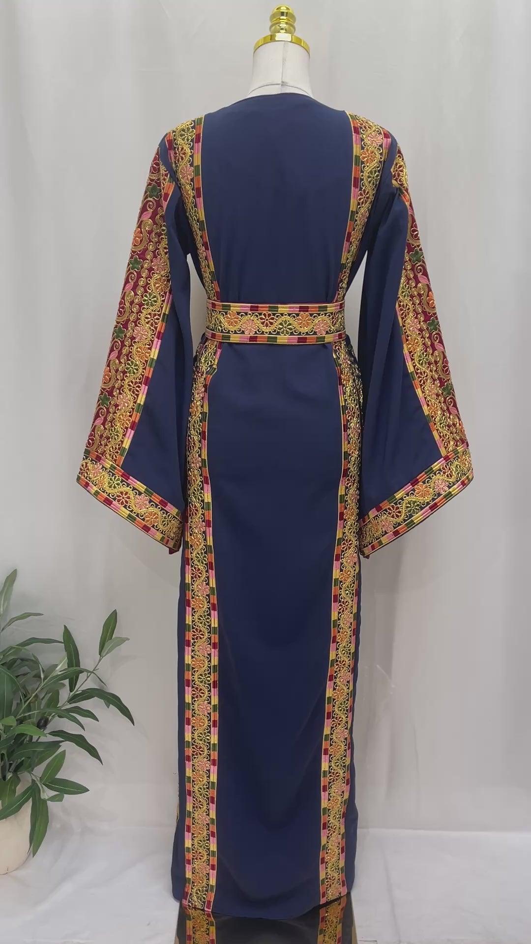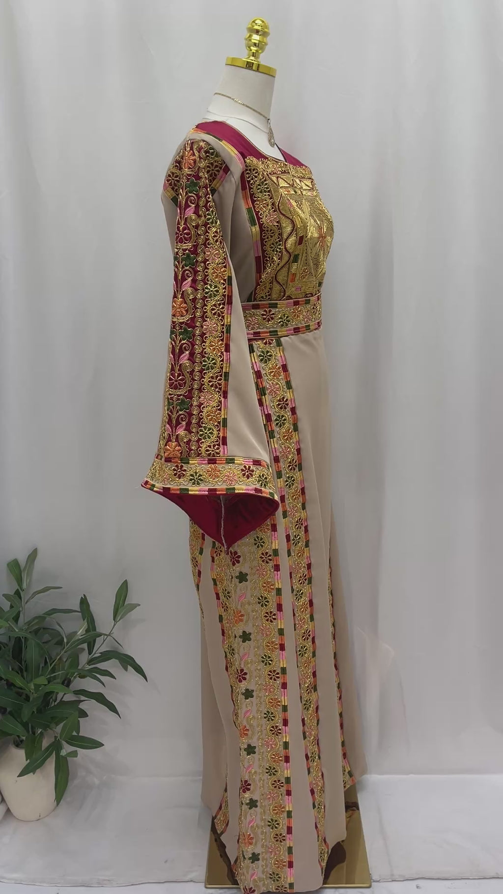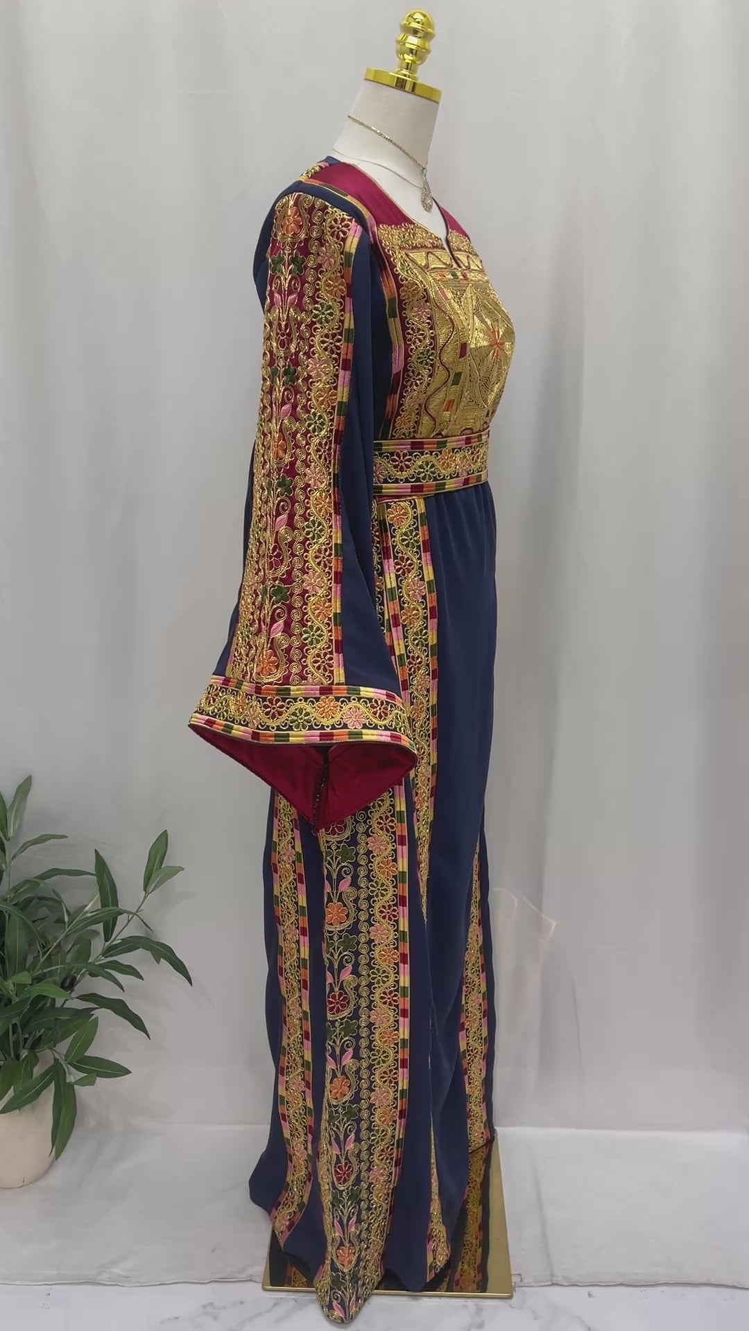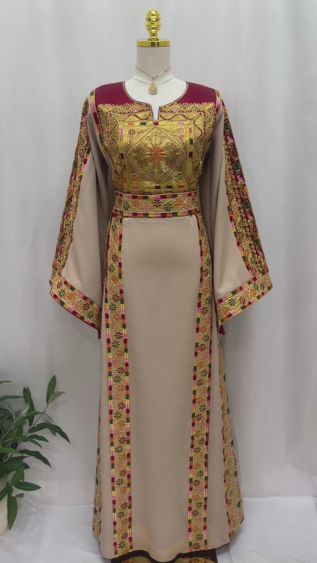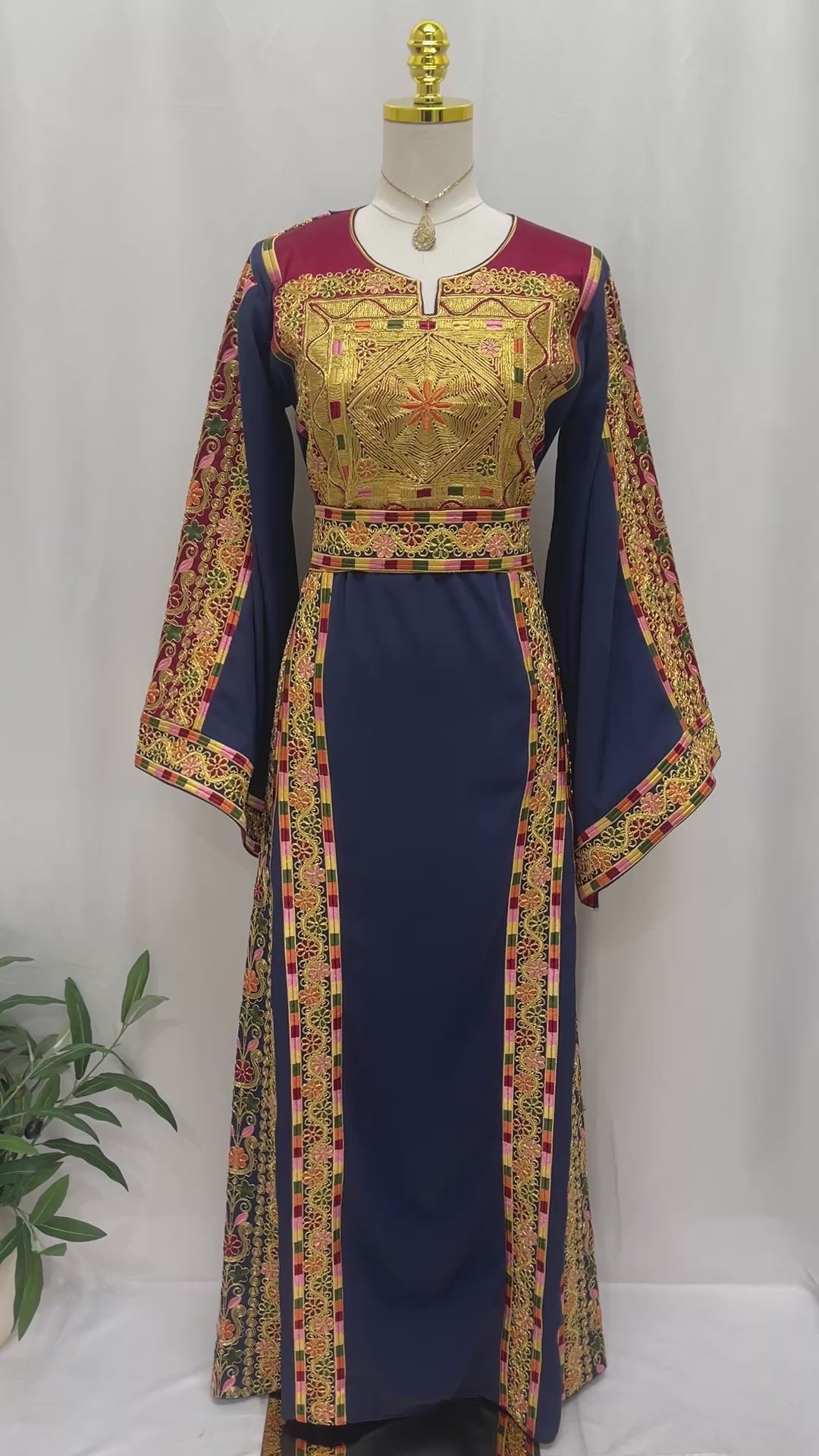 A luxurious heritage thobe that blends authenticity and elegance, available in two shades (tahini beige and navy) with refined burgundy accents. It is adorned with dense golden qasab embroidery across the chest, sleeves, and outer panels, giving it a majestic royal presence. Includes a matching embroidered belt to highlight the silhouette, embodying the essence of authentic Palestinian tradition.