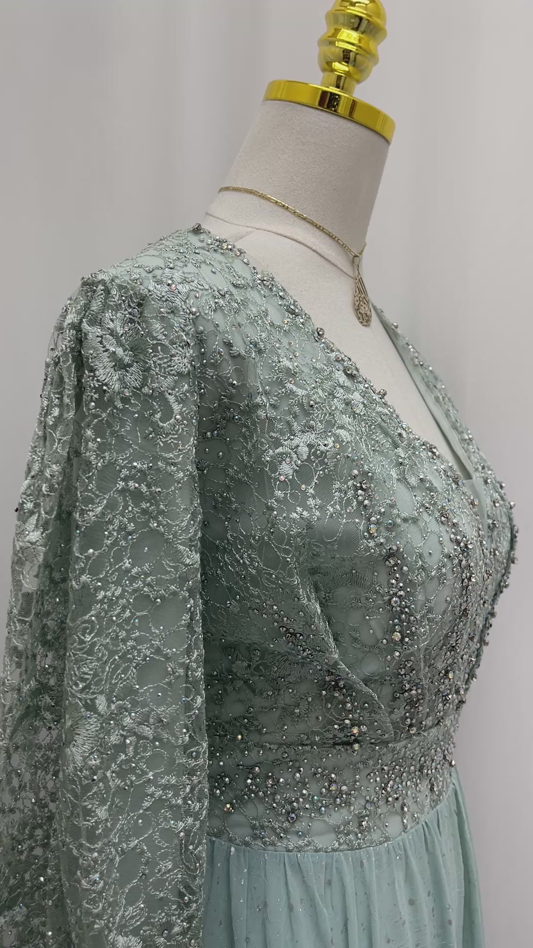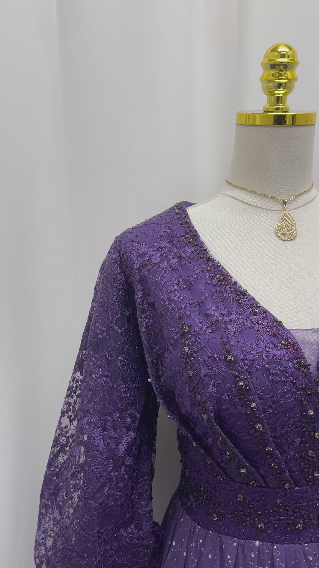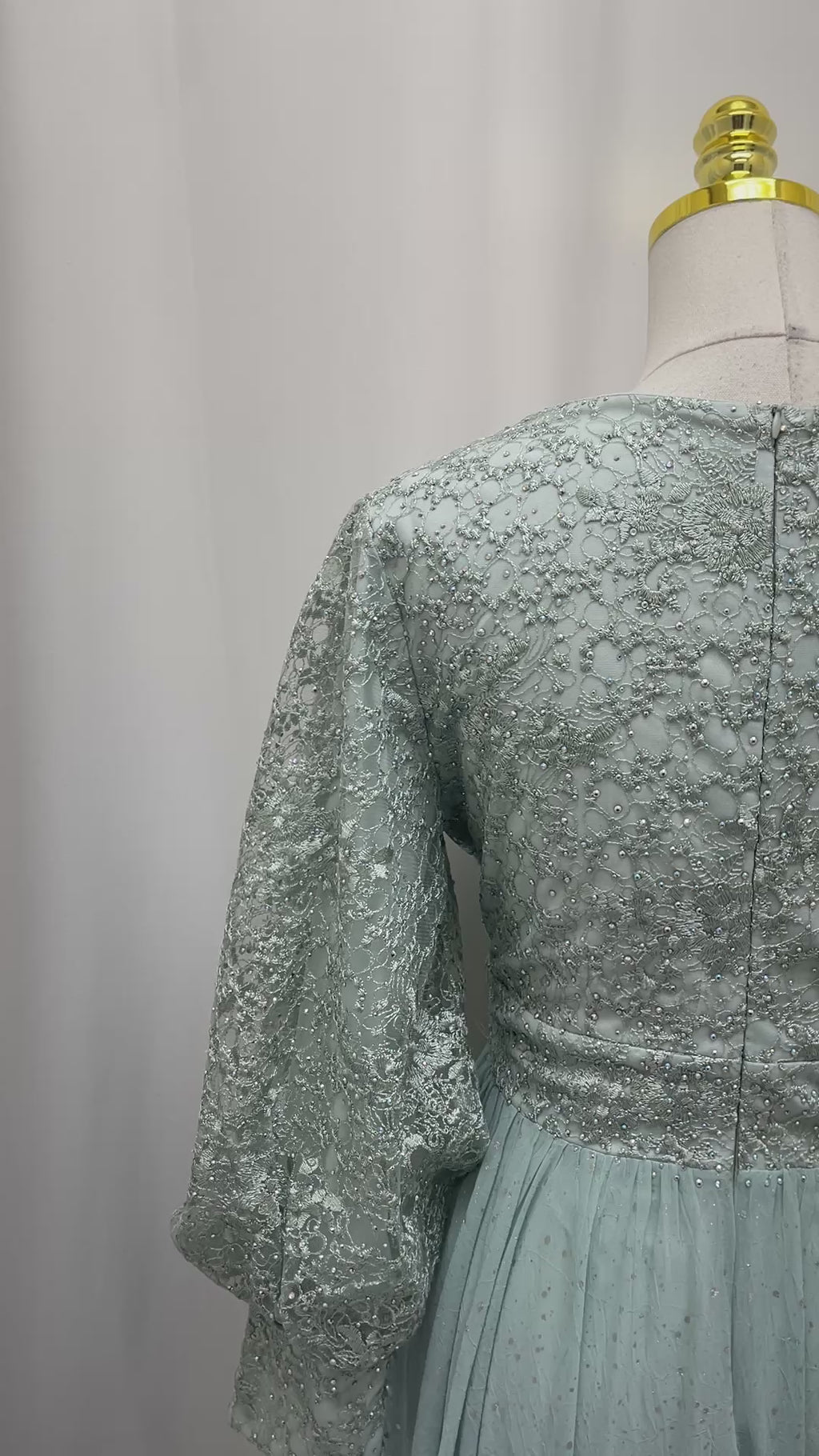 A luxurious evening gown designed for a graceful and elegant look. The bodice features delicate embroidered lace with sparkling beadwork, paired with voluminous sleeves that add a refined, royal touch. The waist is accented with shimmering embellishments to enhance the silhouette, while the flowy sparkled skirt creates soft, feminine movement with every step.