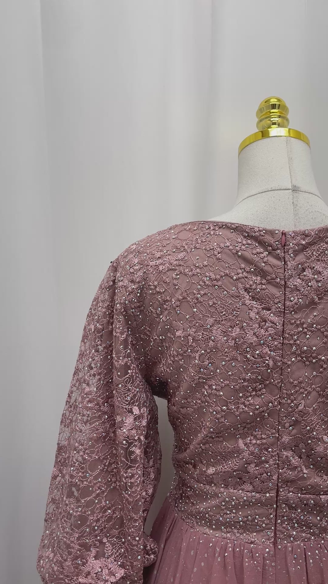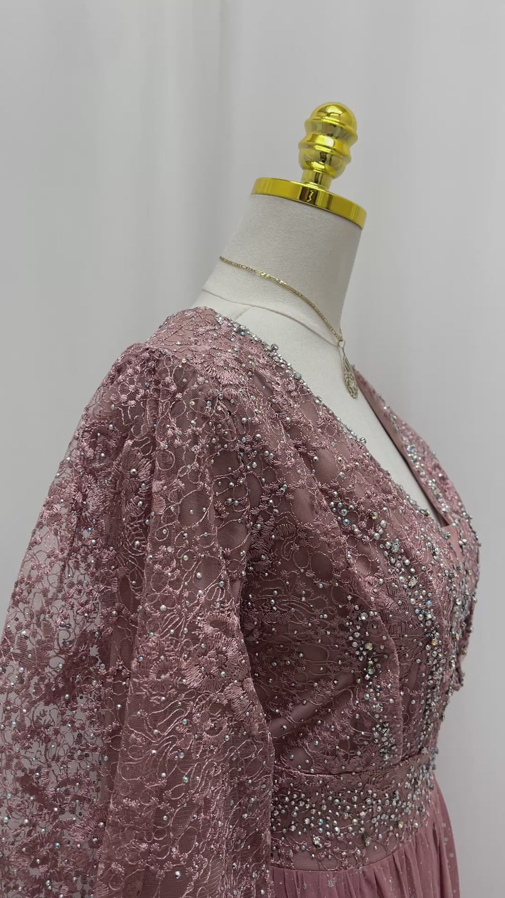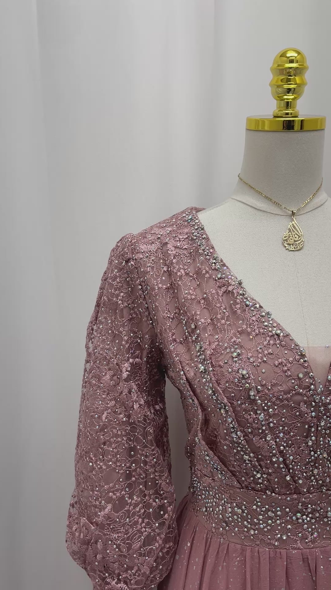 A luxurious evening gown designed for a graceful and elegant look. The bodice features delicate embroidered lace with sparkling beadwork, paired with voluminous sleeves that add a refined, royal touch. The waist is accented with shimmering embellishments to enhance the silhouette, while the flowy sparkled skirt creates soft, feminine movement with every step.