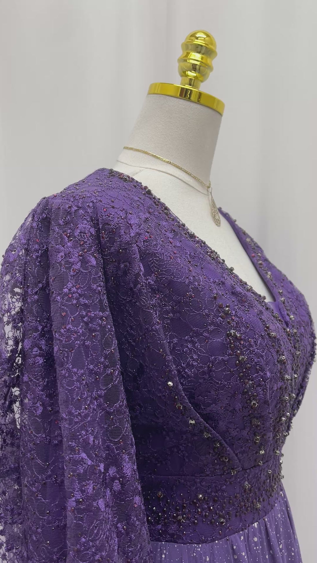 فستان سهرة ملكي بتفاصيل أنيقة تضيف حضور فخم ومميز. الجزء العلوي مصنوع من دانتيل مطرّز بخرز ولمعات ناعمة توزّع الضوء بشكل جذاب، مع أكمام واسعة تمنح إطلالة راقية. الخصر مشدود بتطريز لامع لإبراز القوام، وينسدل التنورة بقماش خفيف منقط بلمعة ناعمة ليمنح حركة أنثوية ساحرة.