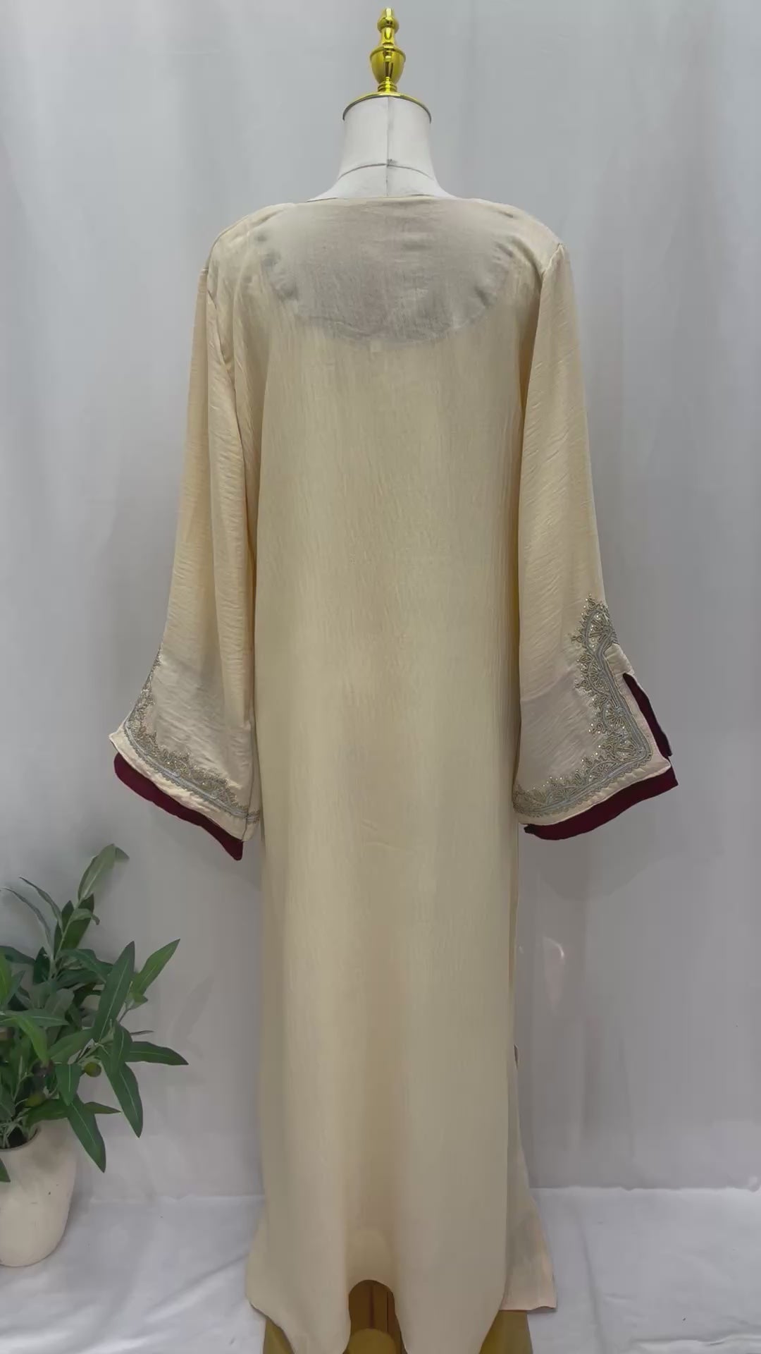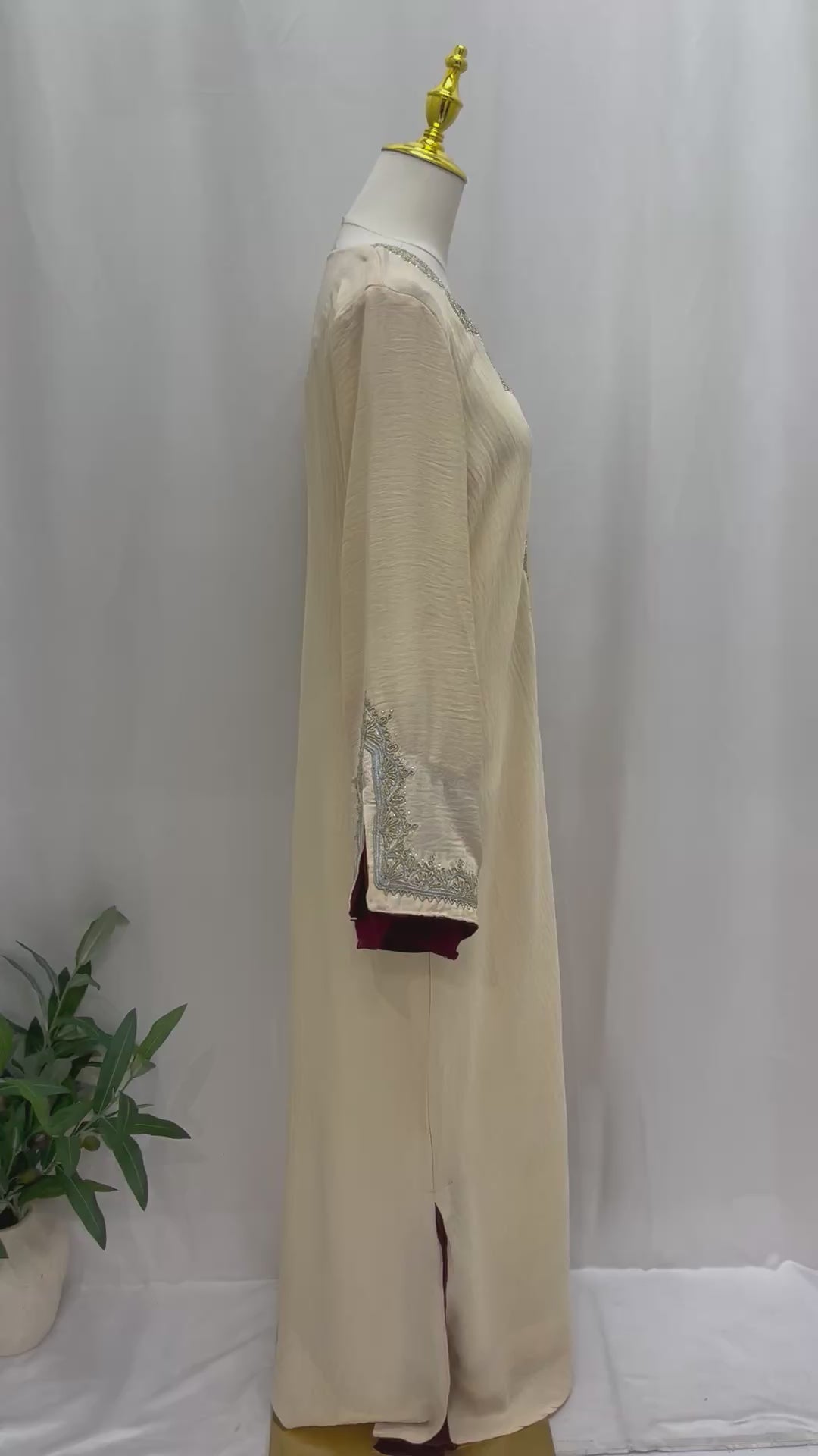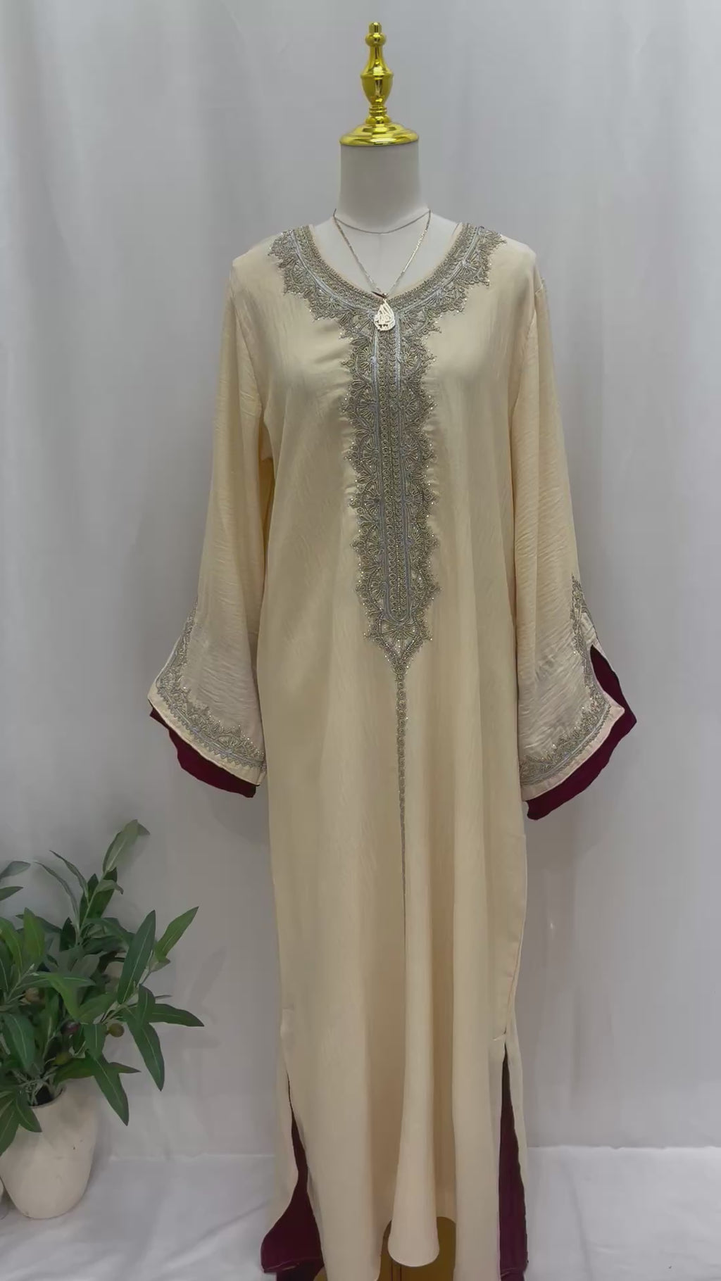 This elegant piece features detailed stitching along the neckline, sleeves, and front. The Moroccan Rana Jalabia offers a flowing drape, perfect for special occasions or daily wear. The design reflects a blend of North African artistry and timeless modest fashion.