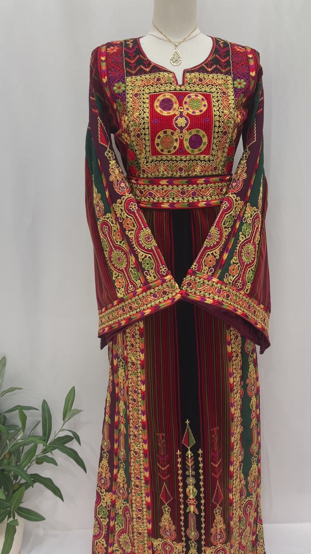 These patterns tell the story of Palestinian heritage through beautifully decorated motifs. Every stitch carries the cultural significance and artistic expression of the region, making this thobe a wearable piece of history.
