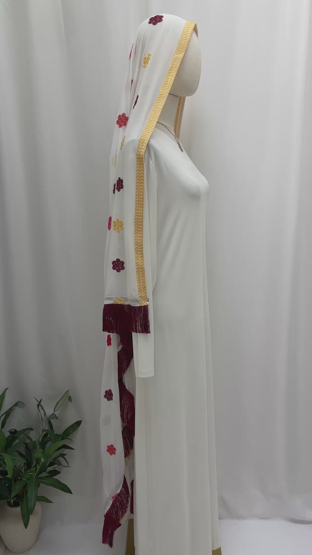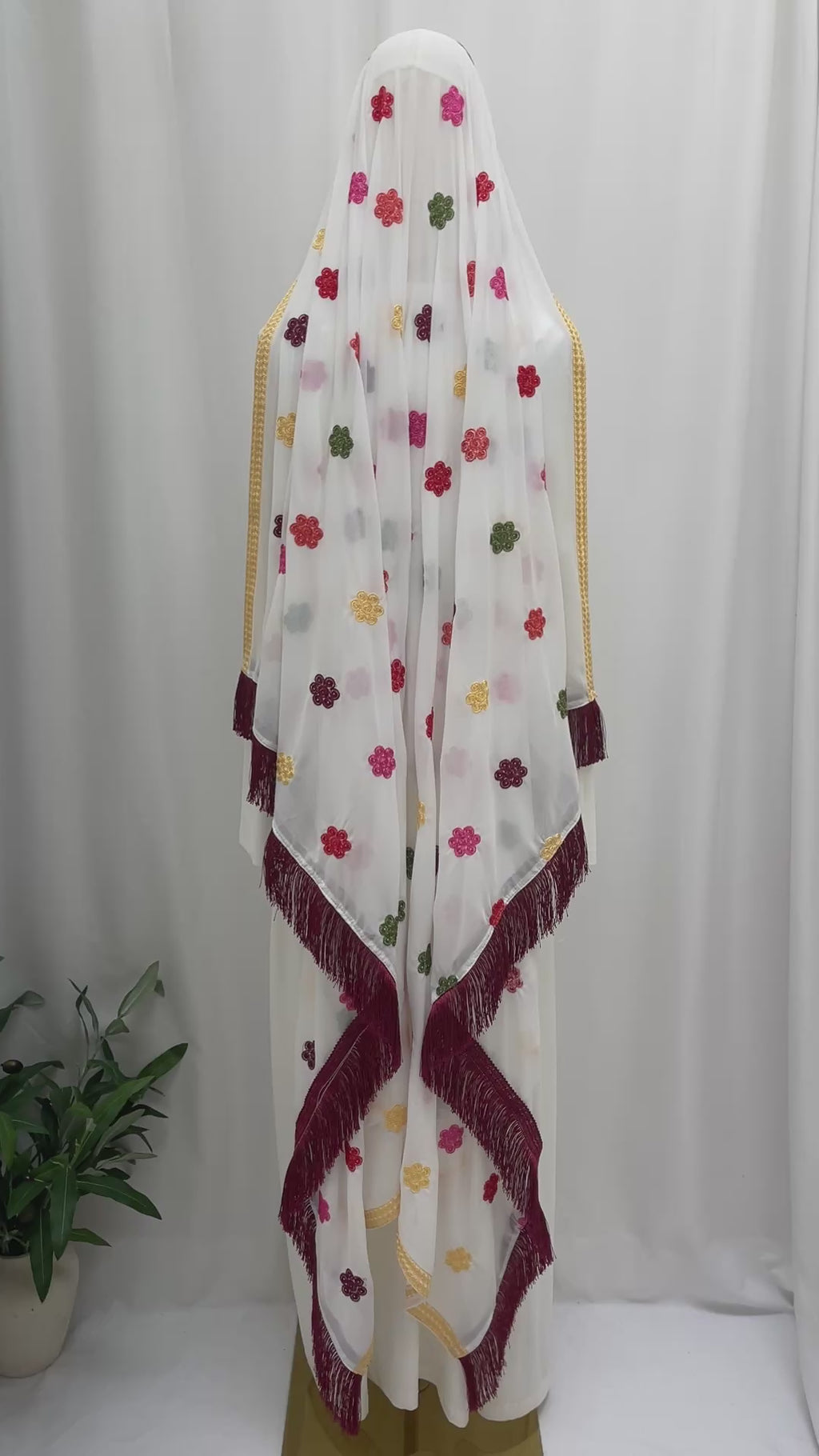 Bride of Blossoms Shal/(khirka) is a delicate and luxurious bridal shawl made from soft white fabric, symbolizing purity. It is embellished with colorful embroidered flowers that add a joyful and graceful touch. The rich burgundy fringed edges elevate its elegance, making it perfect for wedding events or henna nights. A piece that blends tradition with feminine beauty for a truly regal bridal look.